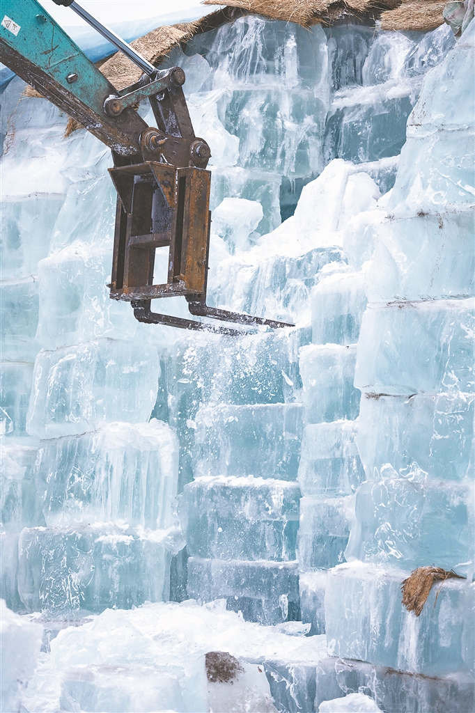 在哈爾濱冰雪大世界存冰場(chǎng),大量保存完好的冰體整齊堆疊,十分壯觀。冰垛之間,吊車、叉車、鏟車、卡車等穿行往返、有序作業(yè),一派熱火朝天的忙碌景象。
