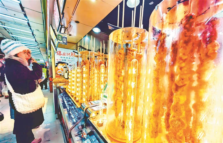 近日,哈爾濱道里菜市場(chǎng)內(nèi)非常熱鬧,許多南方游客到這里品嘗美食、打卡拍照。鍋包肉、紅腸、烤肉串等食品,格瓦斯、凍梨汁等飲品都受到青睞。