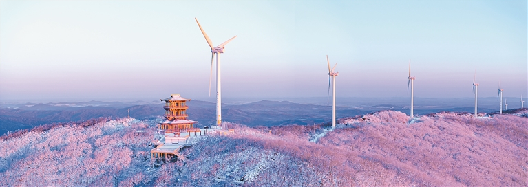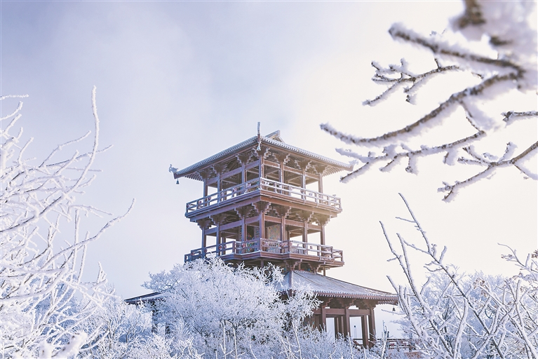 山林間云霧彌漫,白雪和蒼勁的虬枝映襯,山頂?shù)奶煊娱w和一個(gè)個(gè)白色巨人般的發(fā)電“風(fēng)車(chē)”相映成趣,將這座名山裝扮得更加素雅、更顯活力。近處,松柏全都凝霜掛雪,戴銀披玉。山頂原始次森林中,低矮的灌木叢也被積雪覆蓋,成為了一朵朵五彩的冰花。高大的樹(shù)木被輕盈的雪花點(diǎn)綴,晶瑩剔透,仿若玉樹(shù)瓊枝,隨風(fēng)搖擺,宛如仙境。