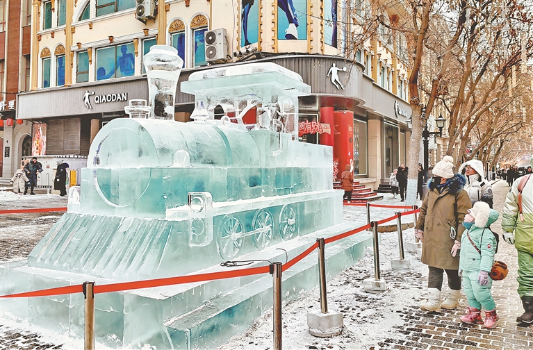 中央大街與西四道街交口,一列冰火車吸引了人們的目光。小火車制作精美,晶瑩剔透,成為老街上一處新打卡點。