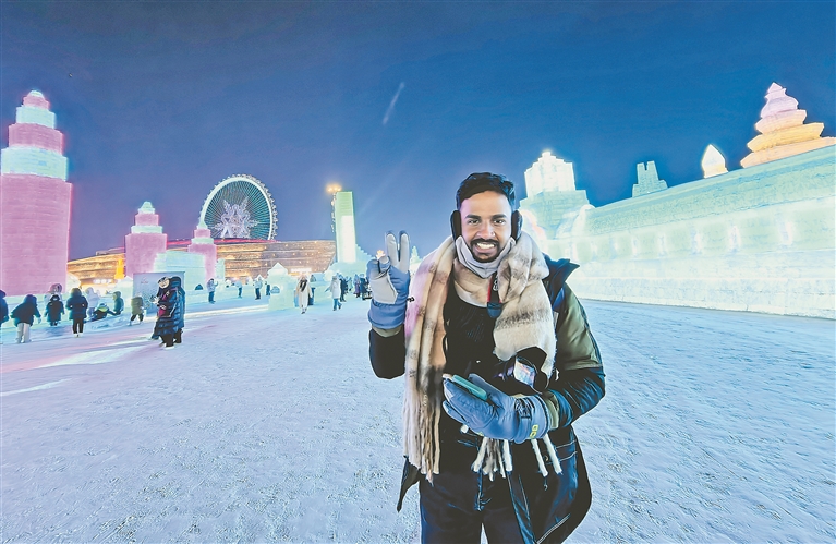 夜幕降臨,園區(qū)里五彩斑斕。徜徉其中,記者不時(shí)與遠(yuǎn)道而來(lái)的國(guó)際友人擦肩而過(guò)。印度游客庫(kù)洲倫一路走走停停,仿佛一位尋寶者,在冰雪編織的夢(mèng)幻王國(guó)中盡情探索。他胸前挎著一臺(tái)單反相機(jī),手中握著手機(jī),眼中閃爍著滿滿的驚奇。每一次駐足,每一次與冰雕雪塑的凝視,都伴隨著按下相機(jī)快門的聲響。