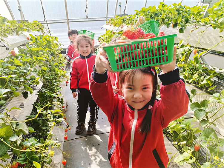 在位于陽明區(qū)樺林鎮(zhèn)的唐櫻園生態(tài)農(nóng)場里,整齊排列著24棟智能溫室大棚。在11號(hào)草莓大棚里,來自同心幼兒園的小朋友正在采摘草莓,孩子們興奮地圍著草莓觀察,“草莓真好看,草莓好甜啊!”
