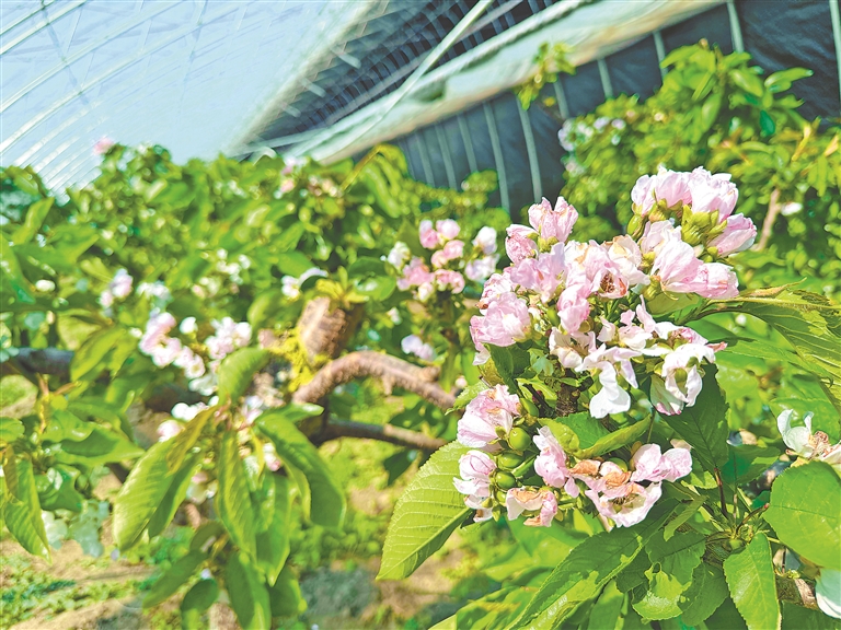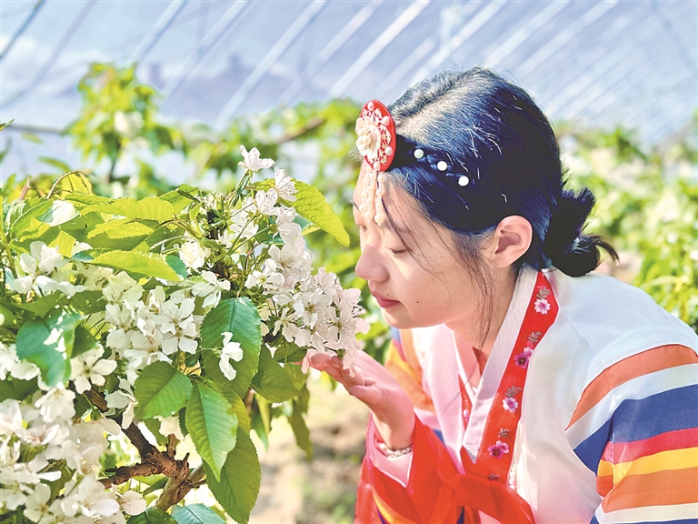 日前,湯原縣湯旺朝鮮族鄉(xiāng)大棚采摘園里櫻桃花大片盛開,吸引游客到此打卡拍照。據(jù)了解,該采摘園共有11棟大棚,種植1000余棵大櫻桃。櫻桃成熟后,果子個(gè)頭兒大,果肉厚實(shí)、硬度大,口感甜蜜,單體重量達(dá)到18克以上,年產(chǎn)量超7000斤,且耐儲(chǔ)存不易開裂,受到市場(chǎng)青睞。