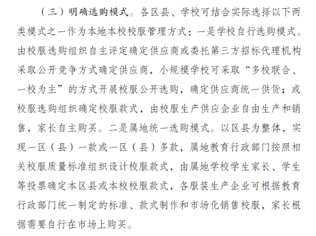 新規(guī)設(shè)計的“自行選購模式”靈活且務(wù)實:規(guī)模較大的學(xué)校可自主評定供應(yīng)商或委托第三方招標(biāo);小規(guī)模學(xué)??刹扇 岸嘈B?lián)合、一校為主”的方式降低采購成本;甚至允許“確定款式后,由企業(yè)市場化生產(chǎn)銷售,家長自主購買”。新規(guī)嚴(yán)禁“定點”“定商標(biāo)”干涉交易,不得設(shè)置不合理入圍條件,確保所有合規(guī)企業(yè)都能公平參與競爭。
