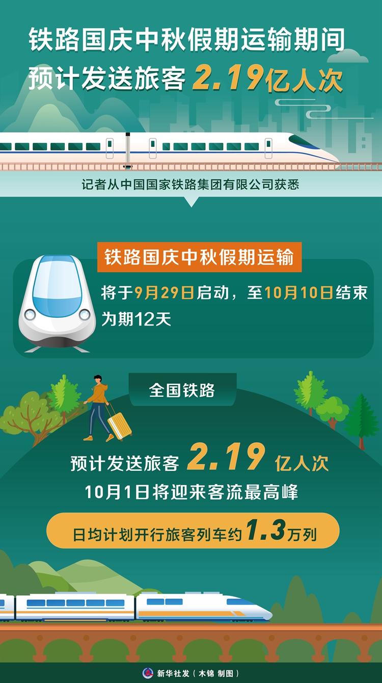新華社北京9月28日電(記者樊曦)記者從中國國家鐵路集團(tuán)有限公司獲悉,鐵路國慶中秋假期運(yùn)輸將于9月29日啟動(dòng),至10月10日結(jié)束,為期12天,全國鐵路預(yù)計(jì)發(fā)送旅客2.19億人次,10月1日將迎來客流最高峰,日均計(jì)劃開行旅客列車約1.3萬列。