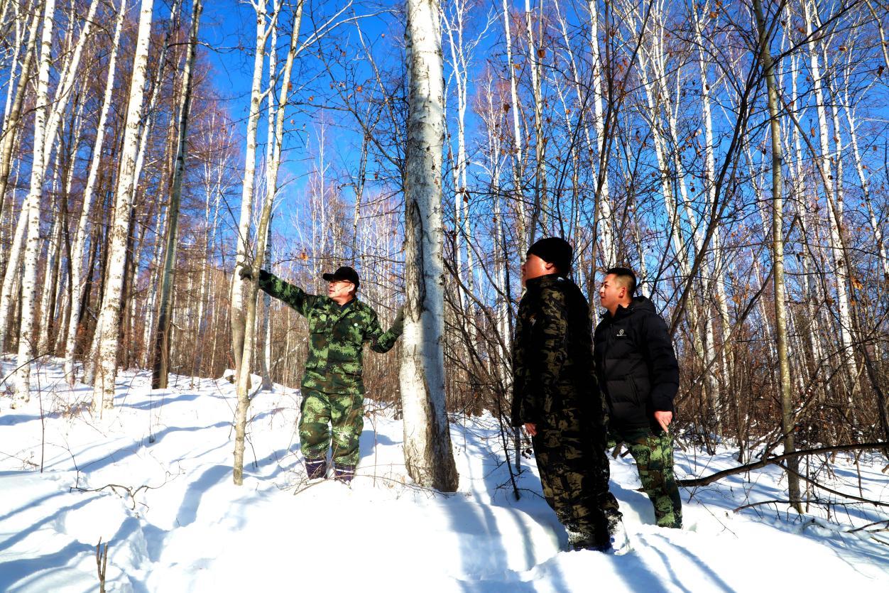 阿木爾林業(yè)局產(chǎn)業(yè)發(fā)展科工作人員踏雪前往1—0干線樺樹汁采集地塊,進(jìn)行踏查(王力 攝)
