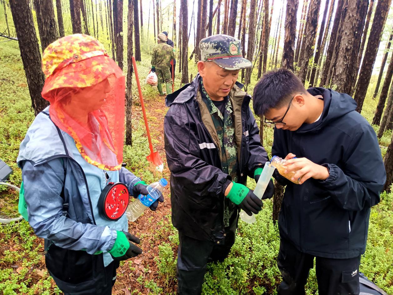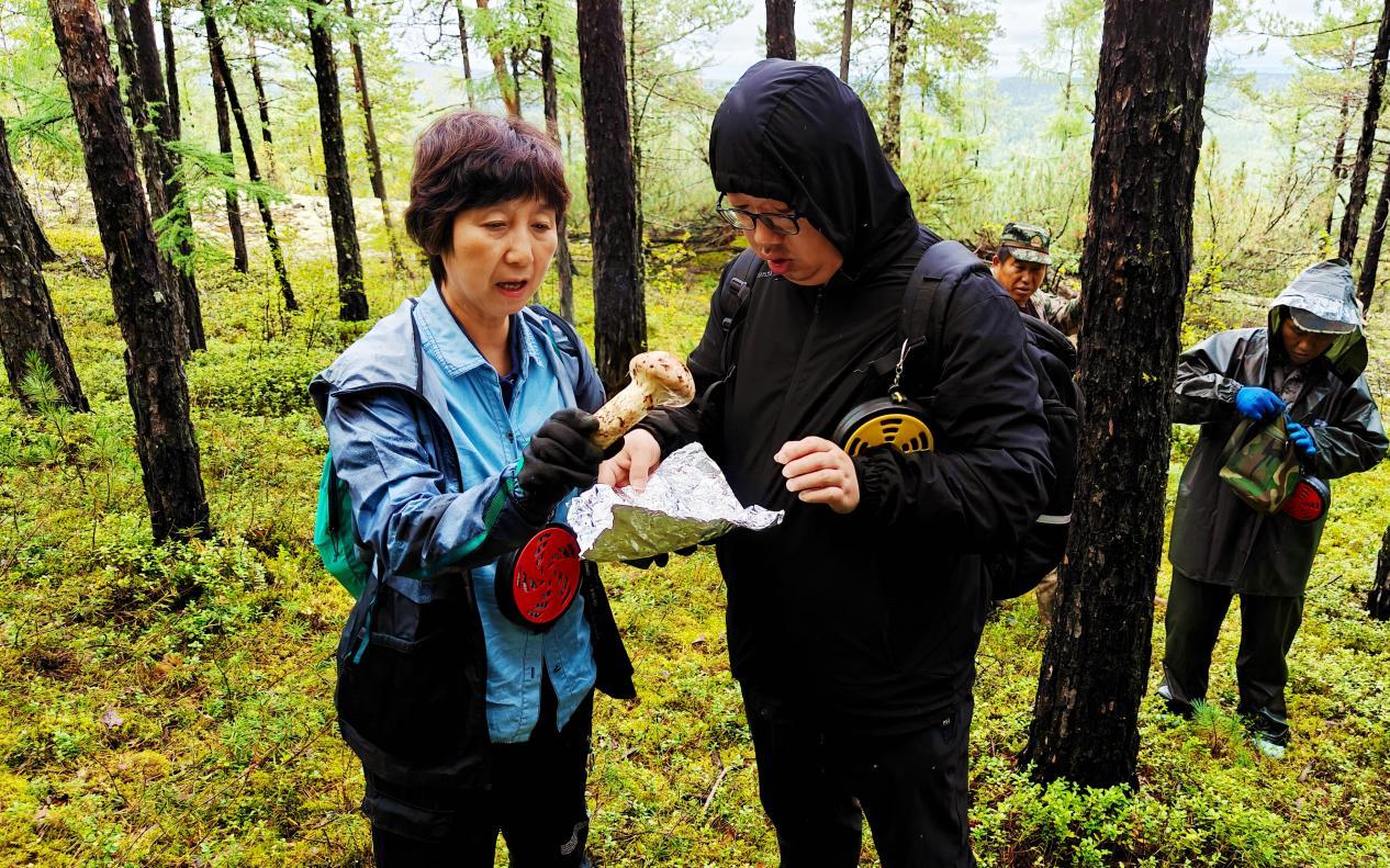 東北林業(yè)大學鄒莉教授(左)查看長山林場野生松茸生長情況(王力 攝)