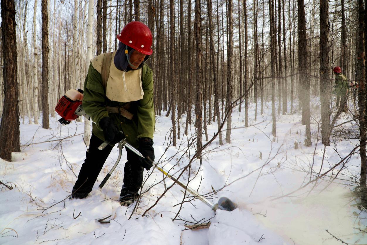 在凜冽寒風(fēng)中,這些“森林園丁”手持割灌機(jī)伐除病腐木、枯立木和風(fēng)折木等被害木,為目標(biāo)樹和保留木騰出更多生長(zhǎng)空間,以堅(jiān)守和付出守護(hù)著林海生機(jī)?!懊刻焓展せ貋?,鞋子、棉褲全是濕的,但看著樹木經(jīng)過修剪能茁壯成長(zhǎng),心中就充滿了成就感。”連續(xù)9年參與冬季森林撫育工作的作業(yè)組組長(zhǎng)張國(guó)生,道出了所有撫育工作人員的心聲。