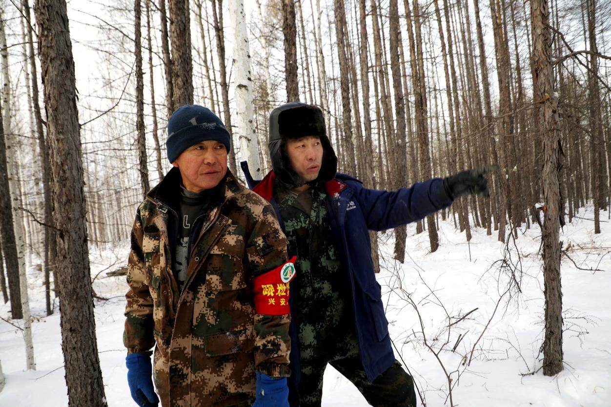 阿木爾林業(yè)局生態(tài)修復(fù)管理科驗(yàn)收員劉明(右)跟班作業(yè)指導(dǎo)生產(chǎn)(王力 攝)