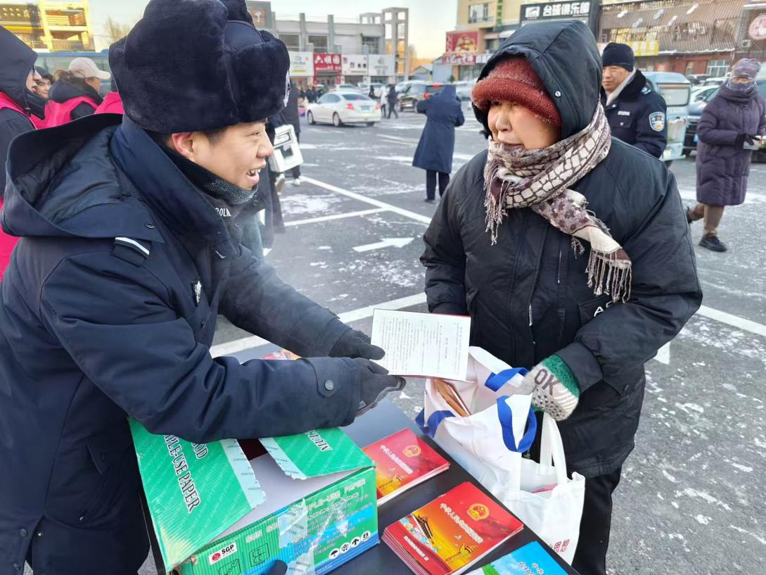 冰天雪地中,民輔警搓著凍紅的雙手仍微笑宣講,逐份發(fā)放《中華人民共和國憲法》讀本、法治折頁與防范指南?!斑@么冷的天還出來送法律知識,這些知識很實(shí)用,拿回去也讓家里人學(xué)學(xué)”,市民李大爺?shù)母锌莱隽巳罕娦穆?,現(xiàn)場咨詢、聆聽的群眾絡(luò)繹不絕,秩序井然。