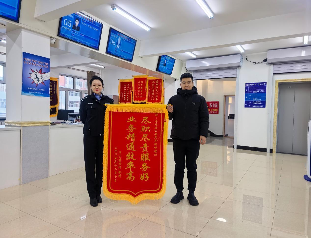 黑龍江經(jīng)濟(jì)網(wǎng)訊(婁暢)近日,一面寫(xiě)著“盡職盡責(zé)服務(wù)好,業(yè)務(wù)精通效率高”的錦旗,被一位車(chē)主鄭重地送到了呼瑪縣公安局交通管理大隊(duì)車(chē)管所的辦事大廳。這面錦旗不僅是一份榮譽(yù),更是一段跨越兩地、高效協(xié)作的暖心故事的見(jiàn)證。