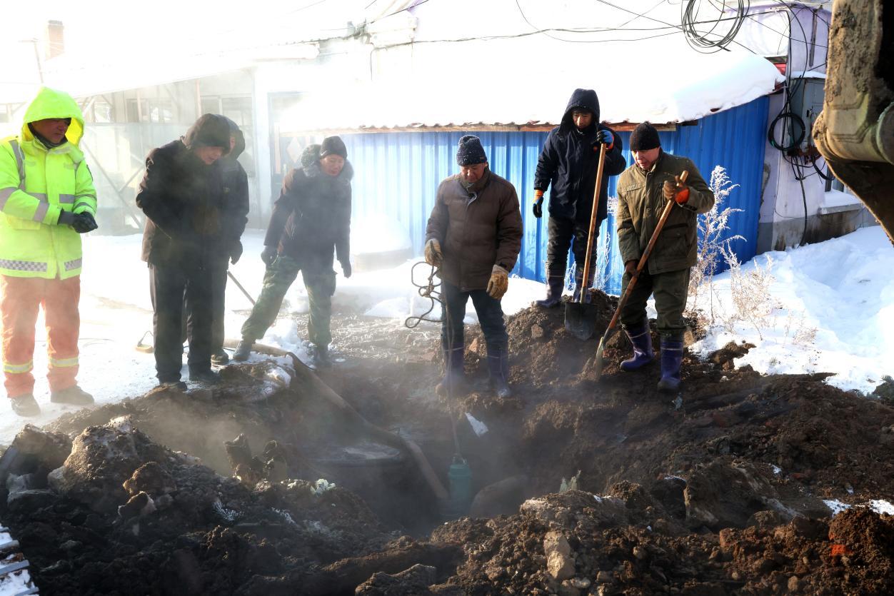 當日早8時許,物業(yè)公司巡線員巡查時發(fā)現(xiàn)西華路平房區(qū)地面冒熱水,立即上報并啟動搶修預(yù)案。7名搶修人員火速趕赴現(xiàn)場,現(xiàn)場分工明確、緊張有序,有的安裝水泵排水,有的接駁應(yīng)急電源,有的揮鎬刨挖凍土層,同時調(diào)配小型挖溝機輔助作業(yè)。