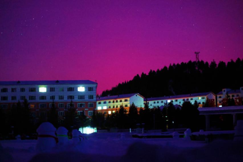當(dāng)日清晨5時(shí)30分,阿木爾林業(yè)局北方天空悄然浮現(xiàn)橘紅色北極光,澄澈夜空中,流動(dòng)的極光如彩綢漫舞,搭配漫天璀璨星河、靜謐連綿群山,還有城鎮(zhèn)里惺忪的燈光,共同勾勒出一幅夢(mèng)幻綺麗的北國(guó)畫卷,裸眼即可清晰觀賞。當(dāng)?shù)鼐用裉婆康谝粫r(shí)間記錄下這一美景,難掩興奮:“往年總盼著夏至能拍到北極光,沒想到冬季也能邂逅這般盛景,親身感受宇宙的壯麗浩瀚,太幸運(yùn)了!”