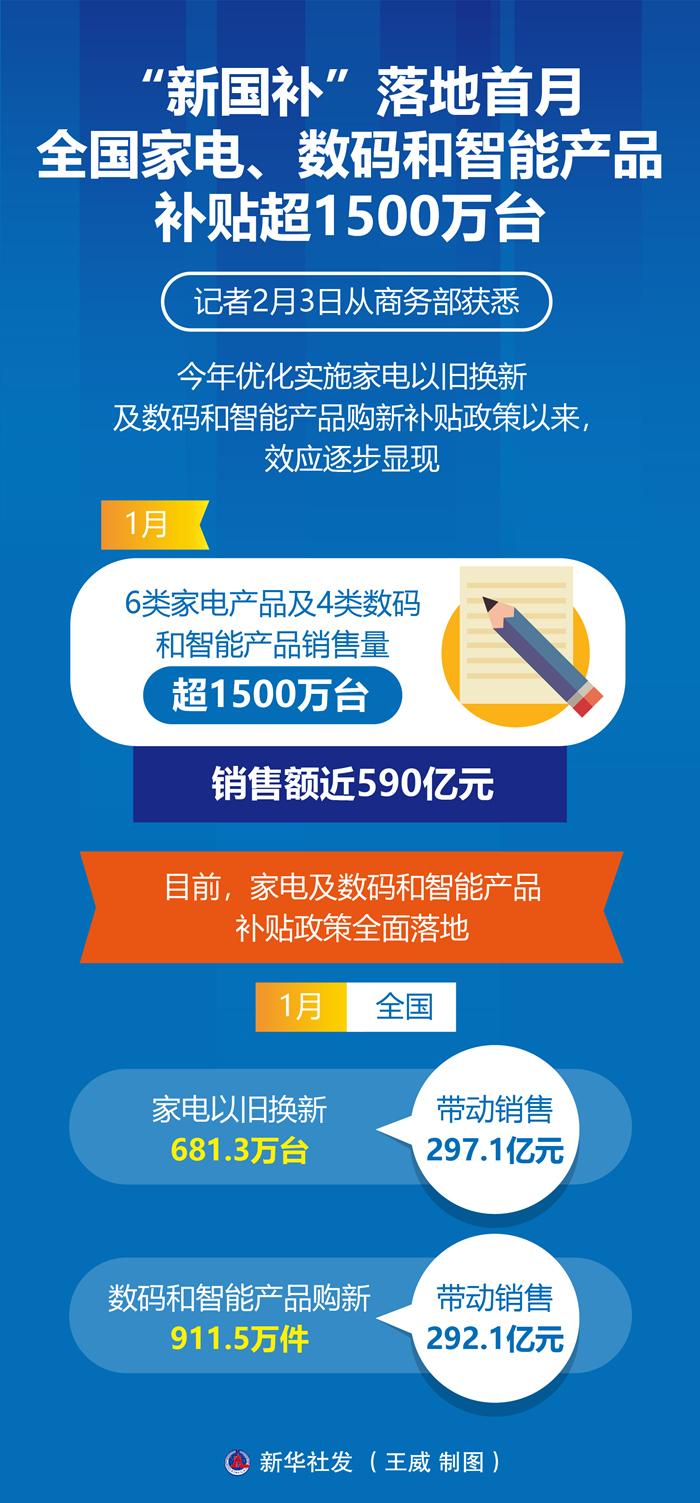 記者2月3日從商務(wù)部獲悉,今年優(yōu)化實(shí)施家電以舊換新及數(shù)碼和智能產(chǎn)品購新補(bǔ)貼政策以來,效應(yīng)逐步顯現(xiàn)。1月,6類家電產(chǎn)品及4類數(shù)碼和智能產(chǎn)品銷售量超1500萬臺(tái),銷售額近590億元。