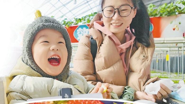 冰天雪地中,推開溫室大棚的門,好像換了一個(gè)季節(jié),孩子們采摘的歡樂彌漫開來。