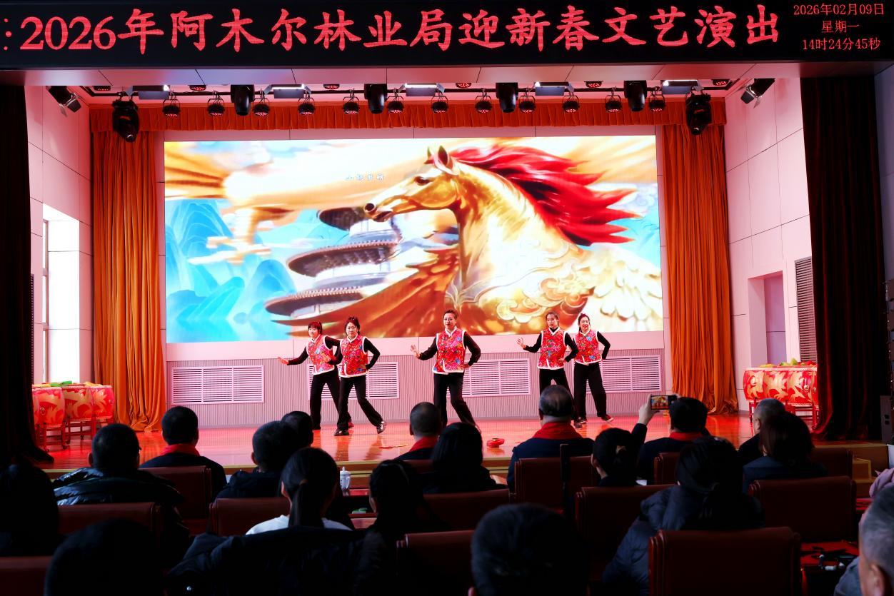 演出伊始,林業(yè)局黨委負(fù)責(zé)人王飛發(fā)表熱情洋溢的致辭,向全體職工及家屬致以新春祝福與誠(chéng)摯問(wèn)候。伴隨著躍馬揚(yáng)鞭、震撼人心的鼓舞《賽馬》,整場(chǎng)演出正式拉開(kāi)帷幕。 歌曲獨(dú)唱、聯(lián)唱飽含深情,《我從草原來(lái)》《越往北越美》《逐夢(mèng)前行》等曲目,唱出林區(qū)人質(zhì)樸赤誠(chéng)的家國(guó)情懷,抒發(fā)熱愛(ài)故土、勇毅擔(dān)當(dāng)?shù)恼鎿辞楦小?/p>