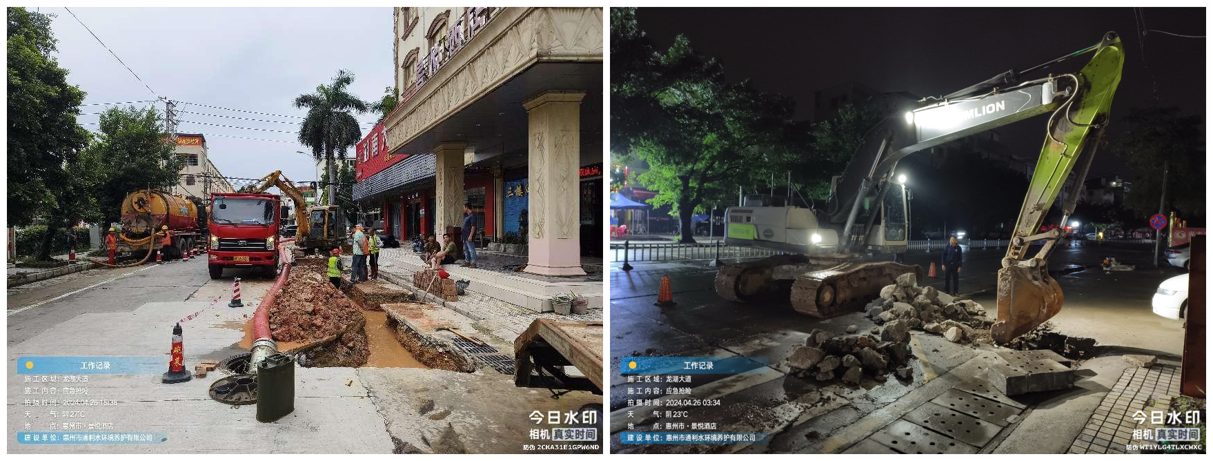 4月25日上午,收到龍湖大道(水口醫(yī)院段,屬惠城區(qū)水口街道辦管護范圍)嚴重積水的汛情求助后,集團陳勉彬董事長率隊迅速到場支援,調配2臺龍吸水設備和12人到現(xiàn)場進行緊急排澇。在集團領導的統(tǒng)一要求和指揮下,通利公司于當天晚上大雨過后,對該段管道進行應急搶修,經(jīng)過一天兩夜不分晝夜雨晴的連續(xù)作戰(zhàn),于4月27日凌晨,順利完成臨時應急搶修工作。